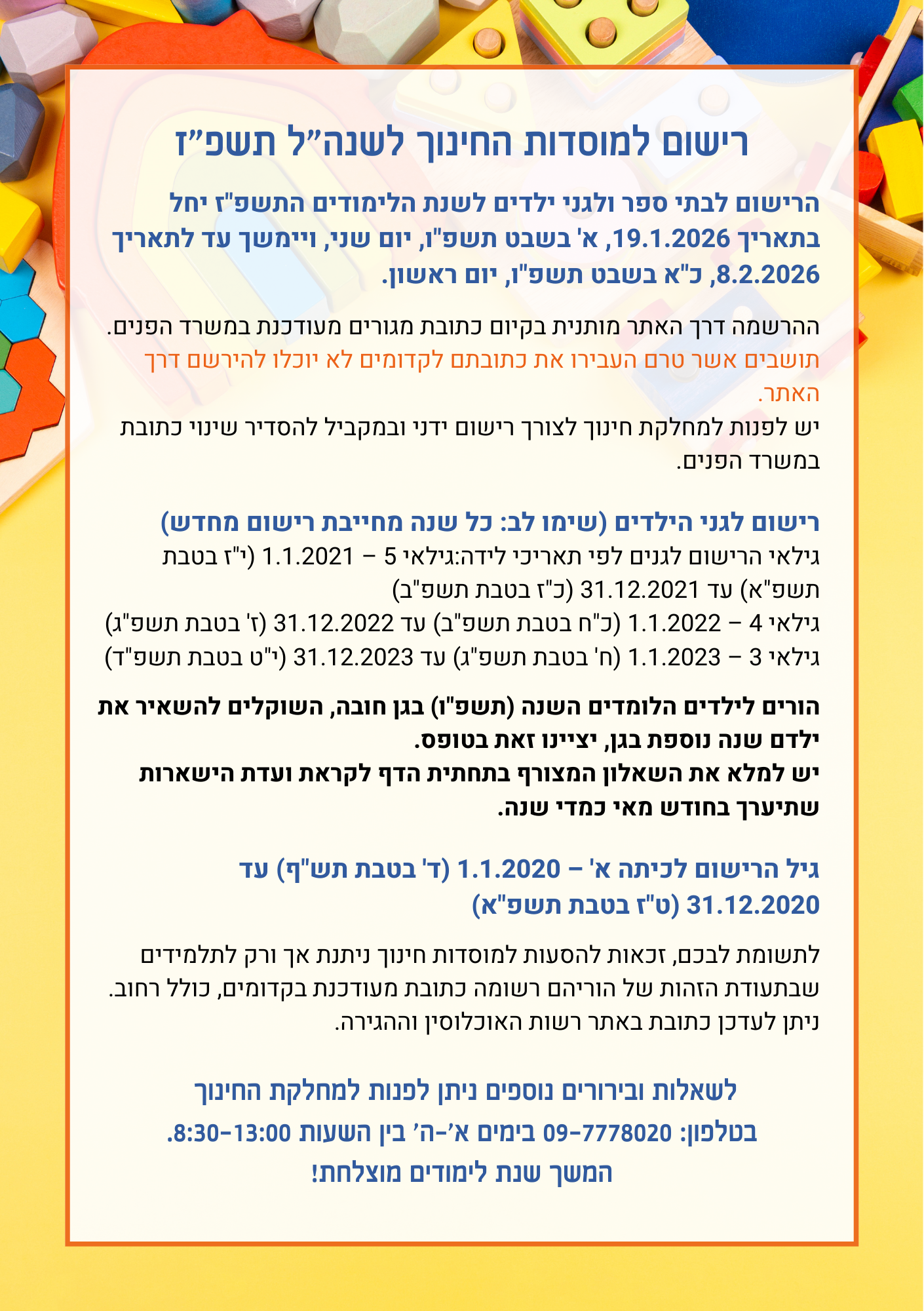 לרישום לגני ילדים ולכיתה א' לחץ כאן