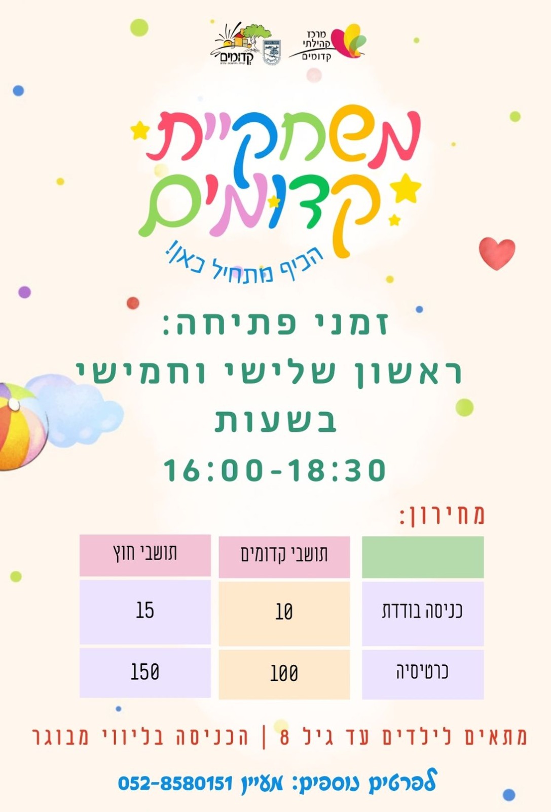 בימי שני ושישי ניתן לקיים אירועים פרטיים במשחקייה– לתאום לפנות למעיין ויגוצקי 052-8580151